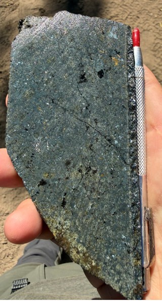 Figure 6. Skarn horizon 4 - Green-garnet skarn with copper and silver sulfides (note the skarn front in the axis of the core sample).