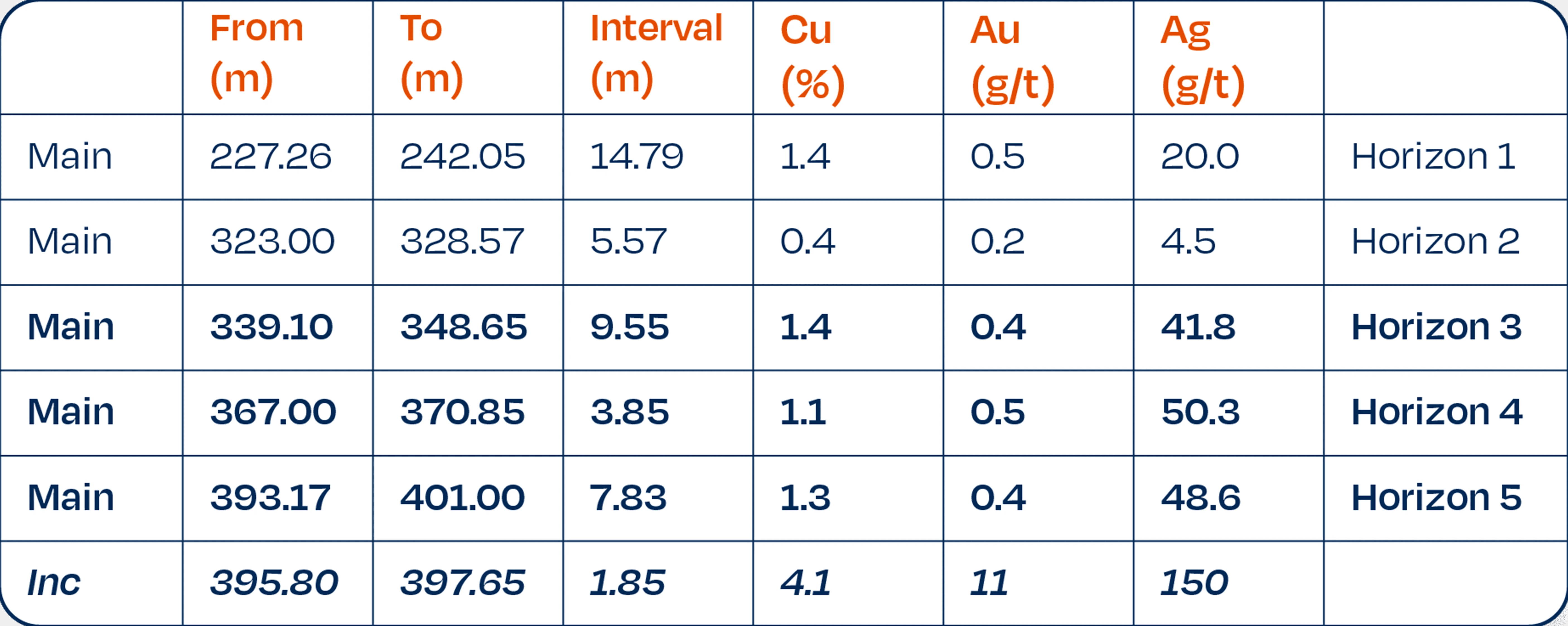 14.79 @ 1.4% Cu, 0.5 g/t Au, 20 g/t Ag