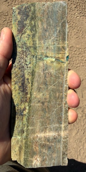 A second newly identified horizon (367.00 and 370.85m), returning 3.85m @ 1.1 % Cu, 0.5 g/t Au, 50.3 g/t Ag. This interval comprises (figure 6) coarse grained garnet skarn with elevated silver values with copper sulfides and oxides disseminated and along fractures, suggesting an enhanced fluid flux or metal zonation at this structural level, with silver introduced or remobilized during a later fluid pulse rather than during peak skarn formation.