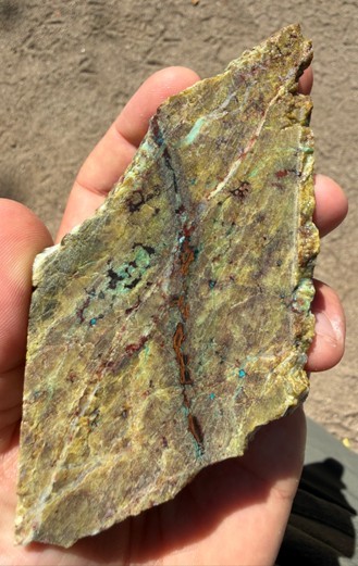 Figure 4. Skarn horizon 2 - Fine grain green garnet skarn, with copper sulfides and oxides along fractures.